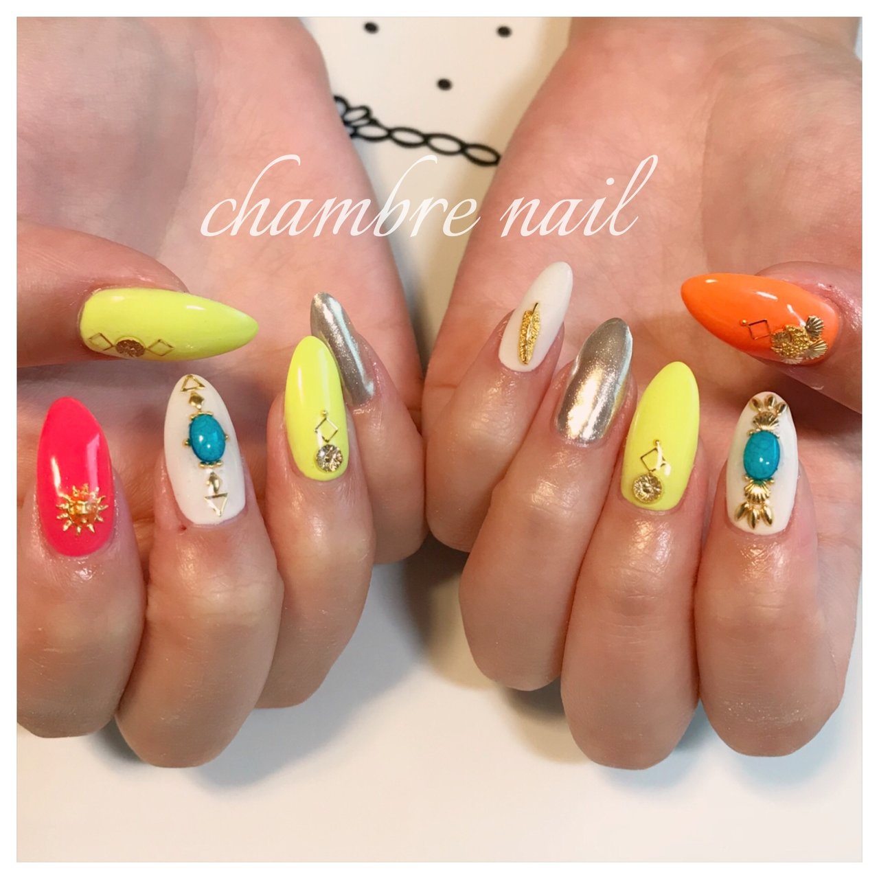 日焼け肌ネイルカラー デザイン 大人のネオンカラー使い ゴールドの輝きで小麦肌をさらに美しく引き立てて ジェルネイルのやり方講座