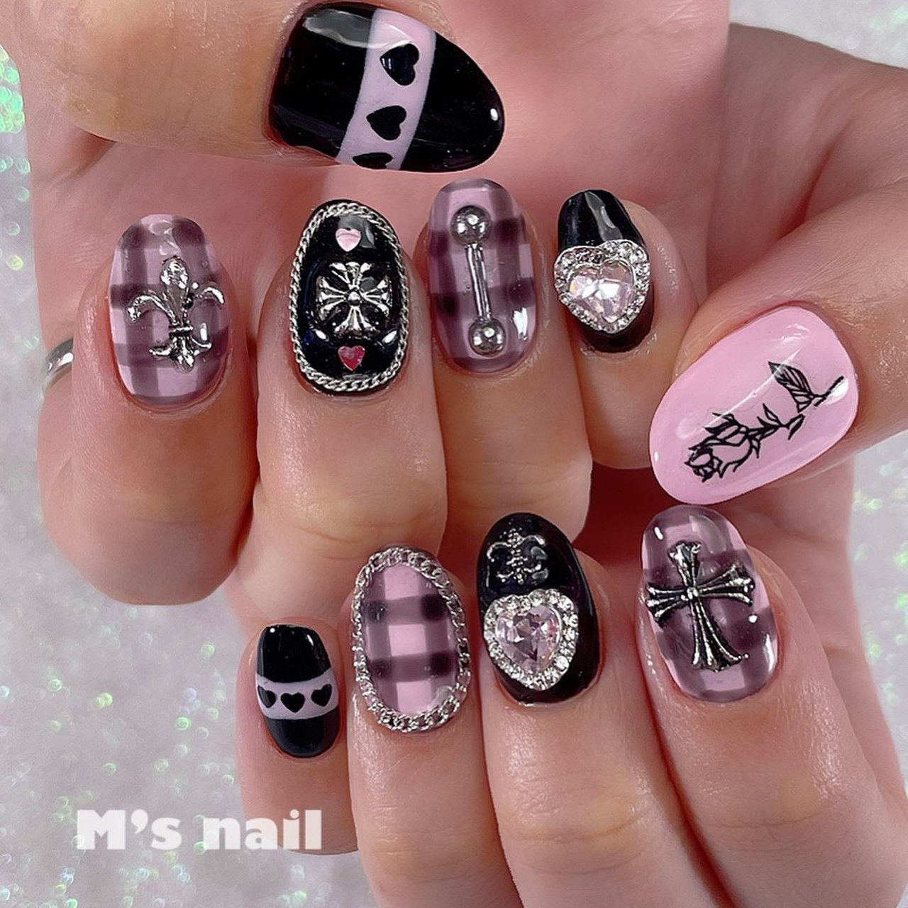 ジェルネイルチップ チェック柄 ハート ビジューラメフレンチ ピンク 黑ネイル ネイルチップ フレンチネイル チェックネイル パールネイル シンプル ネイル Vrm Mx